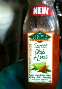 This is more of a product review, perhaps, than a recipe. When I was shopping for fish, I noticed that Whole Foods had grouper that was already covered in a marinade of some type…and it looked pretty tasty. Since I wasn’t buying to cook on the same day, I asked what they used for the marinade so I could do it myself later. They were using Cindy’s Kitchen Sweet Chili & Lime Marinade…conveniently placed right there in the produce section beside the fish counter. I had already discovered Cindy’s Roasted Garlic Caesar Dressing (which is way yum), so I picked up a bottle of the marinade to take home.