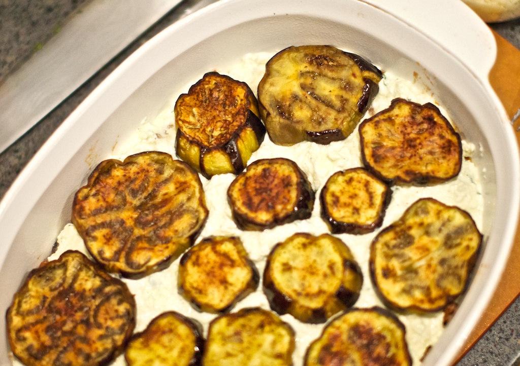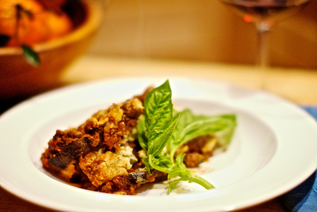I’m not sure what to call this…it is based on moussaka, but is also similar to lasagna sans the noodles. Instead of topping the casserole with a cheesy cream sauce, to avoid the use of flour I decided to include a Parmesan-ricotta layer between the eggplant layers. Also in my version, the eggplant slices are roasted in the oven instead of breaded and fried. This recipe has lots of steps, but at the end it comes together easily and it can be prepared ahead of time…leaving you free to enjoy a nice adult beverage while it cooks!