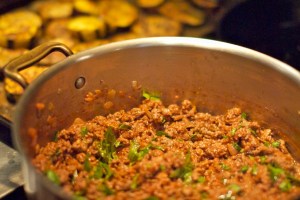Now for the sauce! In a Dutch oven, saute the onions in EVO over medium high heat until tender (about 5 minutes), then add the garlic and stir for about 30 seconds. Add the ground lamb and ground beef and cook until done, stirring to break up the clumps of meat. While that is cooking, roll up several leaves of basil (like rolling a cigar), then thinly slice. Or chiffonade…if you want the fancy instructions. You’ll want a nice handful of basil, so keep going until you have it. Drain off the excess fat from the meat. Add oregano, cinnamon, majoram, salt, and tomato sauce. If you want a little bite to it, add some red chili flakes too. Reduce heat and simmer for about 20 minutes. Remove from heat and stir in a good handful of basil chiffonade.