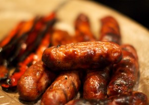 I ran across this recipe on Serious Eats and thought it sounded pretty good….but this was soooo beyond good! This bacon jam is unbelievably tasty – so amazing that James said it was “slap your momma”-good (adding not my momma, no one would ever want to slap her). Bacon is great on it’s own, but this is bacon-on-crack. The aroma is heavenly and may cause drooling…then there’s the first taste. All the smoky, chewy goodness of bacon with sweet caramelized onions and garlic, melded with hints of maple syrup, coffee, cider, and bourbon … candied bacon perfection! I can’t think of a thing it wouldn’t be good on! We proved beyond a shadow of a doubt that it is awesome with grilled pork banger sausages, grilled red bell peppers and Waldorf salad.
