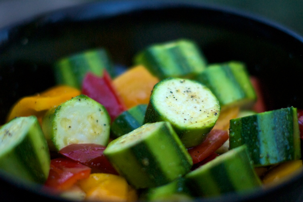 Place zucchini and peppers into a large bowl and toss with enough olive oil to coat. Season with salt and pepper and toss again.