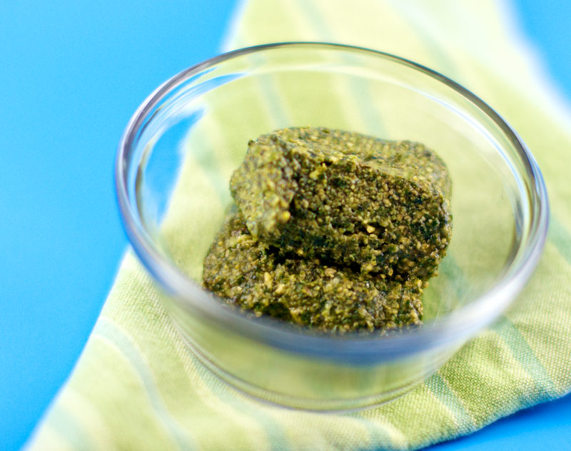 I made this pesto from basil grown in our yard, and kept it frozen in a log in the freezer. If you plan on freezing your pesto, you should use less olive oil than usual so that it can be rolled into the log shape. When I need some pesto, I just slice off what I need, thaw it, and reconstitute with a little olive oil and freshly grated Parmesan cheese.