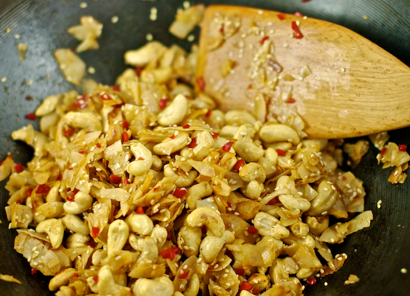 Heat the oil in a wok or large frying pan. Stir in the honey; after a few seconds add the nuts and coconut. Stir-fry for about a minute, then add the chopped chillies.
