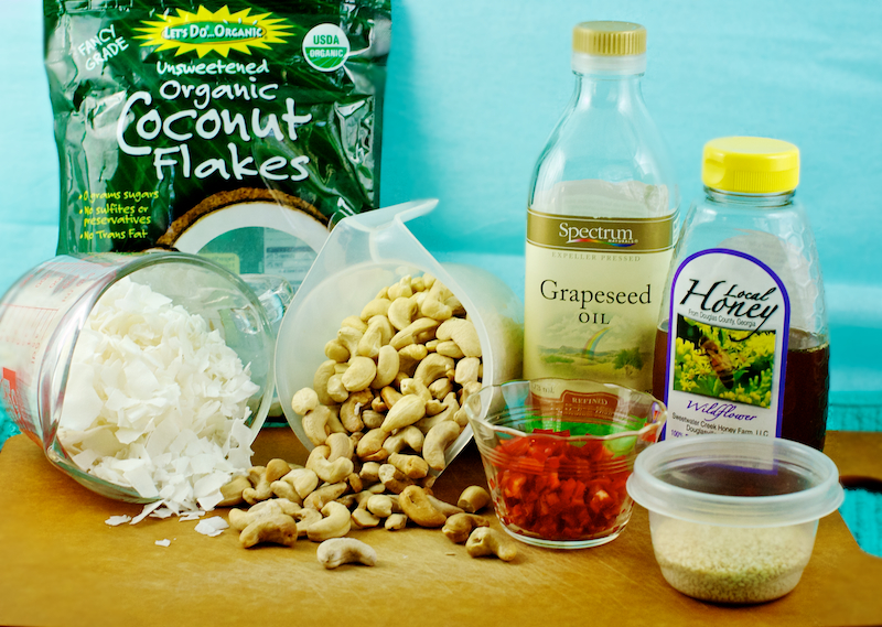 Update on this snack: We wanted it to be crisper and not as sticky, so I put it on a parchment papered baking sheet and baked it for about ten minutes (I think) at 350F. It was a lot better…but you really have to watch itin the oven. Those coconut flakes will burn in a second if you turn your back on them.