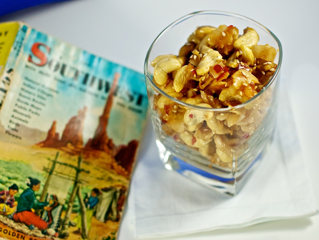 In anticipation of our flight to Albuquerque this weekend, I have been looking for some interesting, primal-friendly snacks for the plane. Traveling in coach, one usually gets the choice of peanuts, cookie wafers, or chips – or a deep breath of recycled air. Well, our snacks are going to be the envy of the travelers seated in the exit row section! These wok-roasted cashew nuts are both sweet and a little spicy, although slightly sticky. Good thing we’ve been saving extra packages of hand wipes from the local barbecue joints!