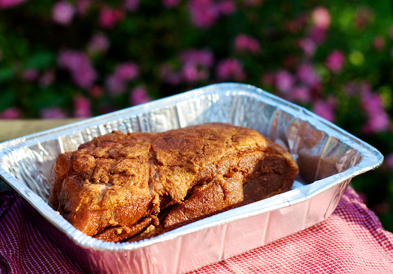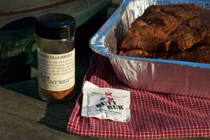 For once, I did not make many changes to the recipe. I used a smaller butt portion (4 1/2 pounds), added a little less salt to the brine (9 ounces), and combined a couple of different rubs.