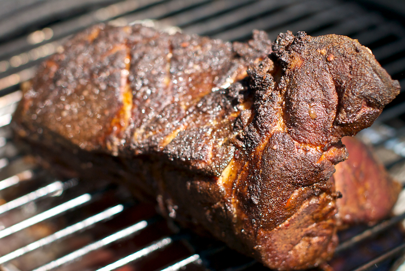 We used chunks of cherry for the smoke. After 4 hours of cooking time, I started spraying the butt every hour with a 1:1 mixture of apple cider vinegar and water, plus about 1 tablespoon of honey, to help keep it moist and to enhance the bark on the outside of the roast. (I would have used apple juice or cider instead of water, but we forgot to get any at the grocery.)