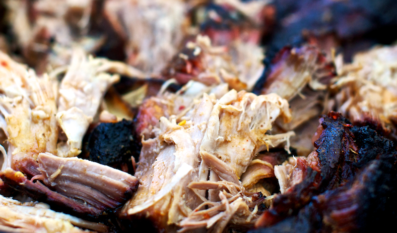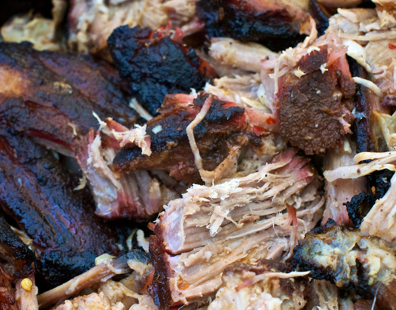 Since it was a smaller butt roast, it only needed 9 hours of cooking time, the last 45 minutes covered with foil to bring the temperature up in the meat. When it was done, we let it rest for an hour (covered), then pulled it apart by hand and finished it with a light application of Lexington style BBQ sauce, recipe also by Dave at Food and Fire.