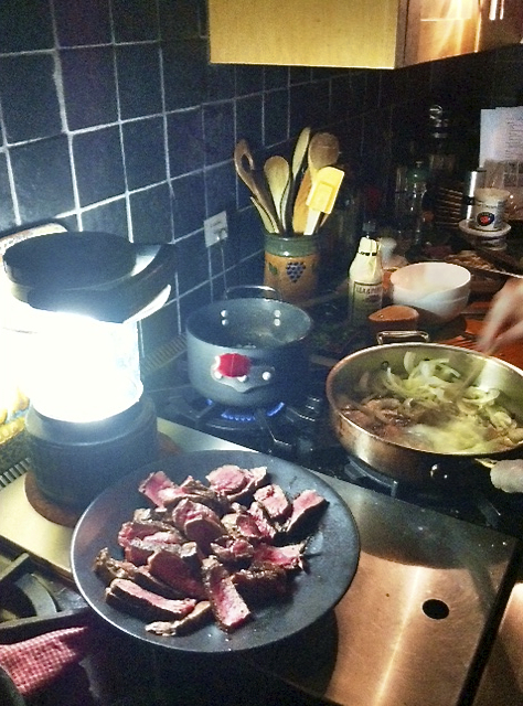 I had already planned on Beef Stroganoff for dinner, so Beef Stroganoff it was. You can’t get much more primal than this! James rigged up a couple of lanterns in the kitchen. Steaks were pan-seared, rested, then sliced into strips. Onions and mushrooms were sauteed in olive oil, simmered in brandy, stock, and Worcestershire sauce until the liquids were reduced, then finished up with sour cream. The steak slices were returned to the pan to warm up and get coated with the creamy sauce. Cauliflower was steamed, then tossed in butter from grass-fed cows. We ate by candlelight and drank Pinot Noir – it was all very romantic! We should do it again sometime…and just pretend the power is off.