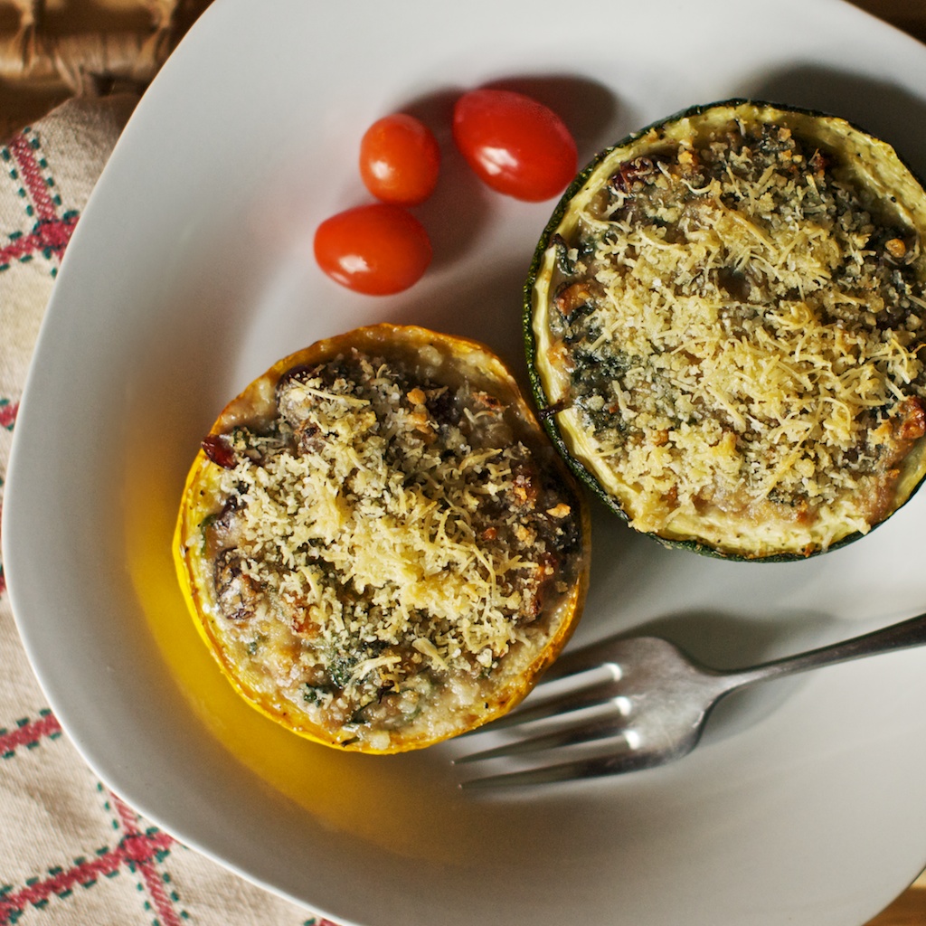 Spoon the spinach mixture into the squash halves. Top with bread crumbs and Parmesan cheese. Bake until the squash halves are tender, but not mushy, and the tops are lightly browned (around 15 minutes). Serve hot or at room temperature.
