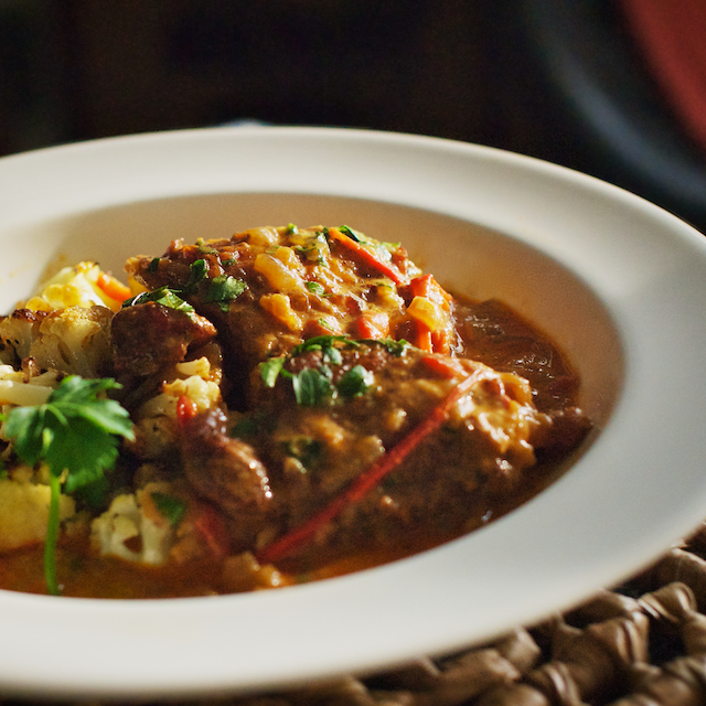 We liked this dish so much we made it again for our friends, Susan and David…who joined us on Friday night for what could have been the last dinner ever! We served the chicken with roasted cauliflower instead of the traditional noodles or dumplings. The chicken was fall-off-the-bone tender, and the spices add a little heat and a lot of aromatics. The sauce is great with roasted cauliflower. There weren’t any leftovers!