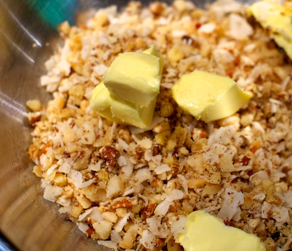 In a small food processor, pulse the nuts and coconut flakes together until coarsely and evenly chopped. (Or chop coarsely by hand.) Using your hands, quickly mix the butter into the nut mixture, until evenly coated.