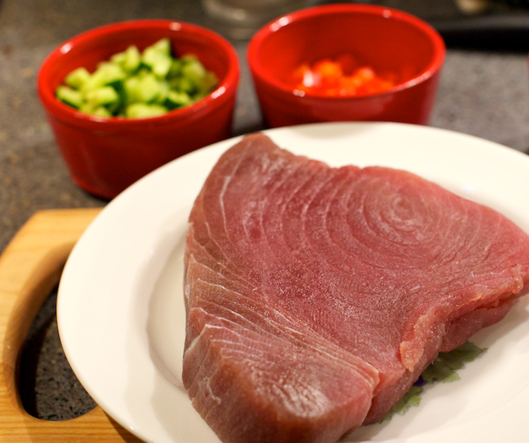 - ~1 pound tuna steak, about 1 inch thick (select steaks that are deeply red with no off-color patches)