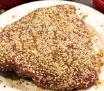 Rinse the tuna steak with cold water and dry thoroughly with paper towels. Season lightly with salt and pepper. Gently press the sesame seed mixture on both sides of the tuna steak, using your fingers.