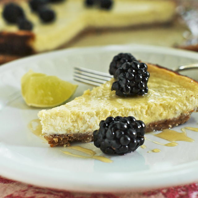If you’re looking for a cheesecake that oozes with confection…just keep clicking because this isn’t it! The simplicity of these ingredients allows you to savor the richness of the cheese (so use the best ricotta and cream cheese you can find). I found the lime to be very subtle, so if you’d like more of a lime taste you may want to add more zest. The coconut in the crust stands out nicely and is wonderful with the macadamias and walnuts.