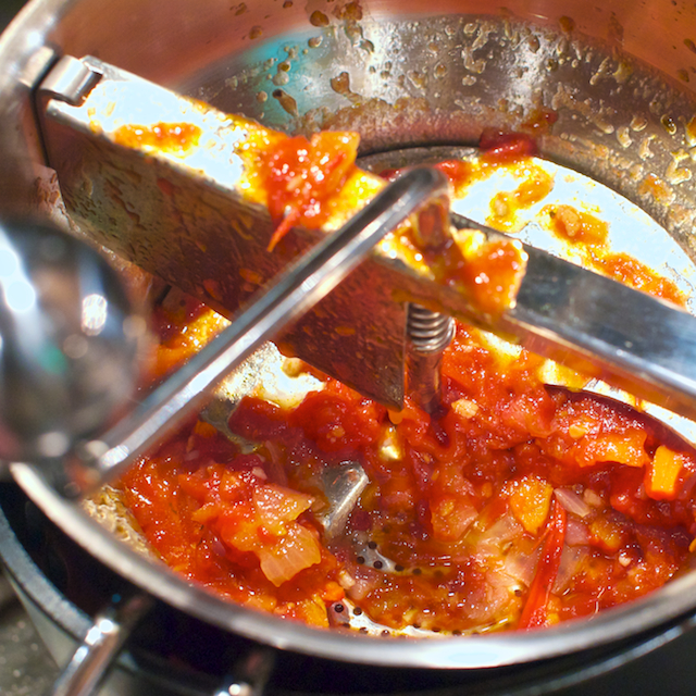 Despite the added need to use a food mill or a strainer, I find it easier to leave the skins on the tomatoes while they are cooking. This does make it more important to choose organically grown tomatoes, as even well-washed tomatoes may have residual pesticides or other poisons in the skin. However, if you wish, you can remove the skins by carving an “X” in one end of the tomato, dunking it in boiling water for about 20 seconds, and then placing it in ice water. The skins should slip right off.