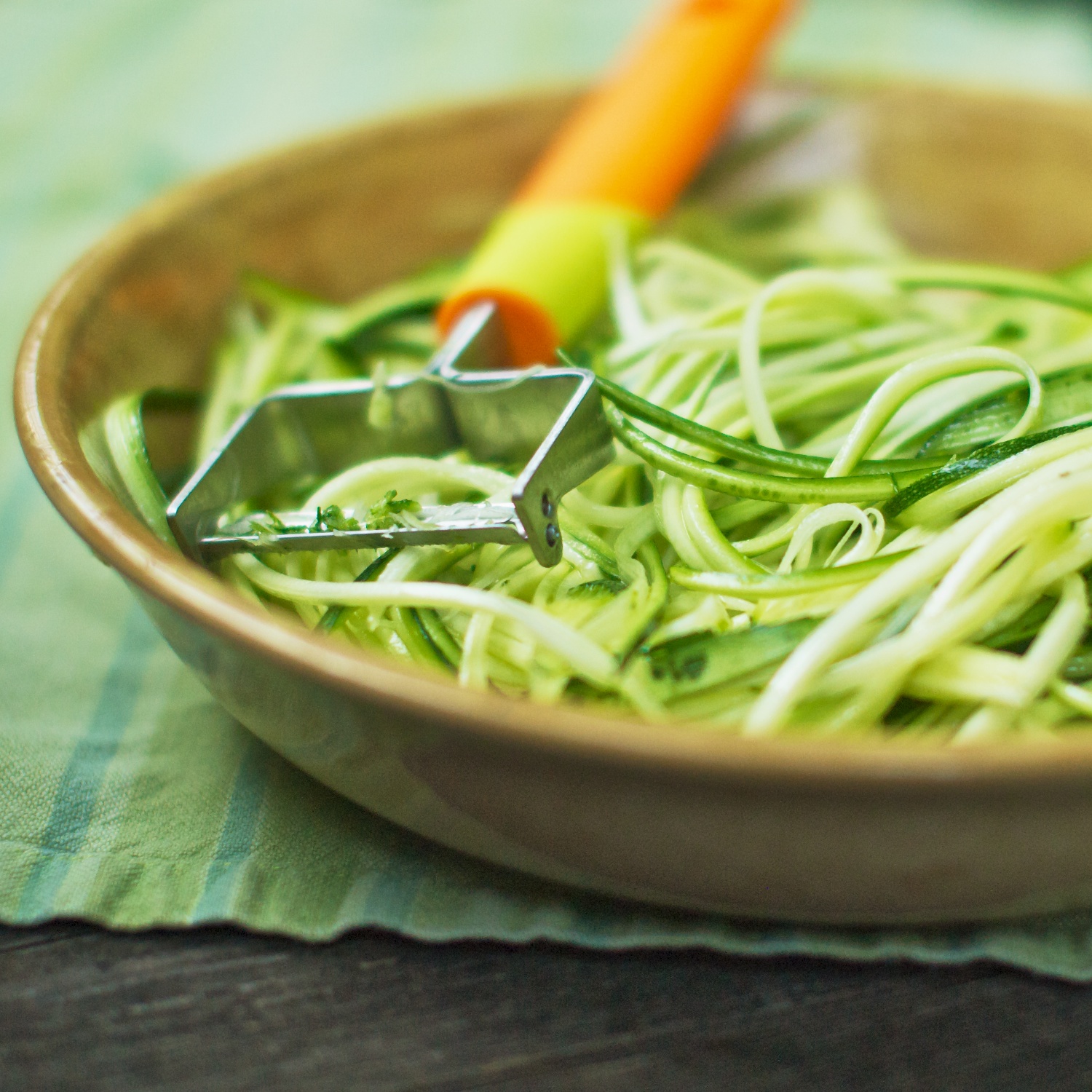 It the Kuhn Rikon Julienne Peeler, which makes perfect tiny strips of vegetables with just a swipe of your hand. This photo is two zucchini that I transformed in less than 5 minutes to a big bowl of noodles. Well, I didn’t actually time the transformation, but it didn’t take long. It probably took longer than necessary because every few swipes I had to exclaim about how wonderful it was to James. After a while, he probably was just thinking about guitar strings or cello music and nodding…but he pretended to be excited and that’s what makes a good marriage.