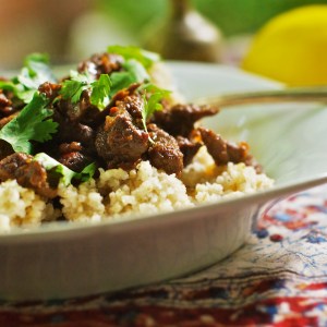 Saute onions in the same pot, until soft. Add lemon, garlic, Ras el Hanout, cumin, coriander, and harissa to the onions and stir until aromatic (about a minute). Return browned beef to the pot. Add beef stock and thyme – stir well to mix. Bring to a boil, then cover pot and place in oven for 2-3 hours, or until meat is tender. You will need to check on this occasionally, and make sure there’s some liquid in the pan. If it starts to dry out, add a little beef stock or water.