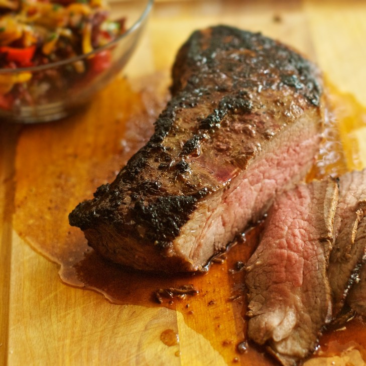 I decided to marinate it to infuse more flavor, and to cook it at high heat for a short amount of time to keep it moist and tender. I was apprehensive, I admit…but man-oh-man, this turned into the best roast beef! It was tender, juicy, and had the most wonderful flavors from the lime, garlic, and cilantro – plus a nice crust on the outside. To accompany it, I made a “relish” of caramelized onions, red bell peppers, parsley, and sun-dried tomatoes – with a little harissa stirred in for a touch of heat. A few slices of oven-roasted zucchini completed the meal. I love it when a meal that I felt daunted by transforms into a medley of tastes that seem born to be together. This was one of those meals!