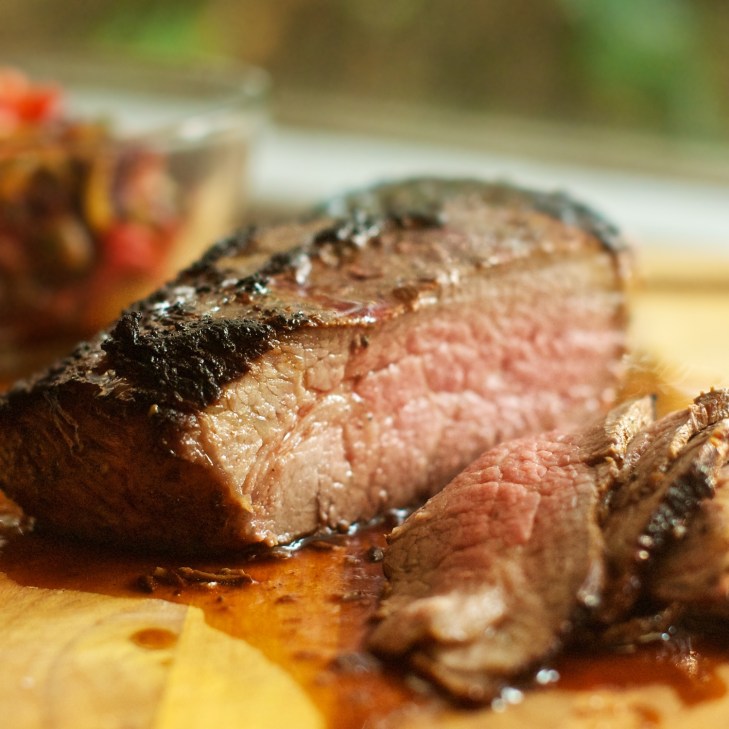 [Alternatively, the meat can be grilled at medium-high heat (around 400F) for 10 minutes on each side, or until temperature in the center of meat reaches 125F as above. We may try this next time, but this week we were too weary to fight the hordes of blood-thirsty mosquitoes.]