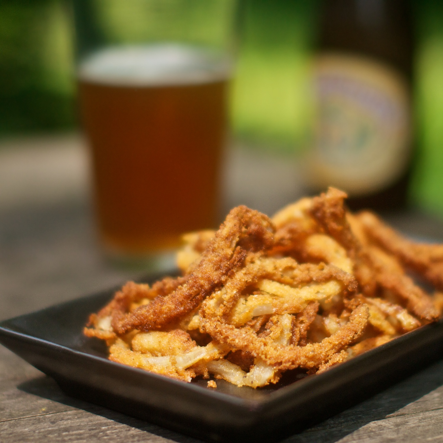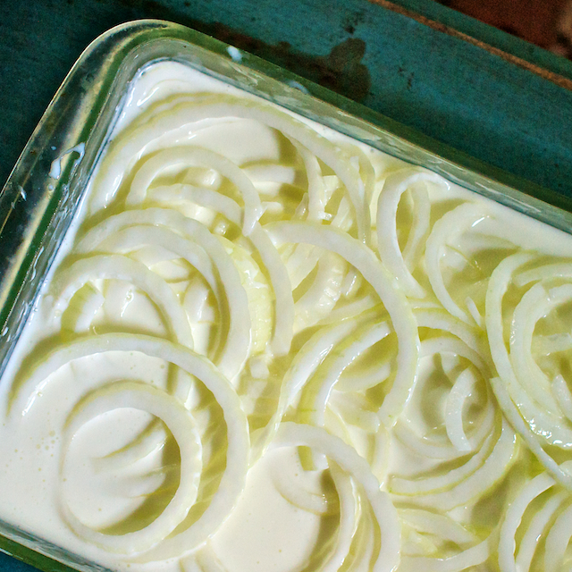 Slice onion very thin. Separate the rings and place in a shallow baking dish. Cover with buttermilk and soak for at least an hour in the refrigerator. (It’s okay if the rings aren’t completely submerged, they just need to have contact with the buttermilk.)