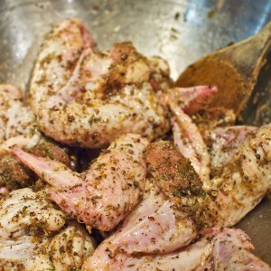 Place the wings in a large bowl and toss with a little olive oil to lightly coat the wings. Sprinkle in several tablespoons of the lemon-pepper seasoning, and toss the wings with your hands, making sure all surfaces of the wings get seasoned. Add more seasoning and toss some more. Repeat until you are satisfied with how much seasoning is on the wings. (Note: You probably won’t need all of the seasoning mix. Just put the leftovers in a sealed jar and keep in refrigerator until next time you need it.)