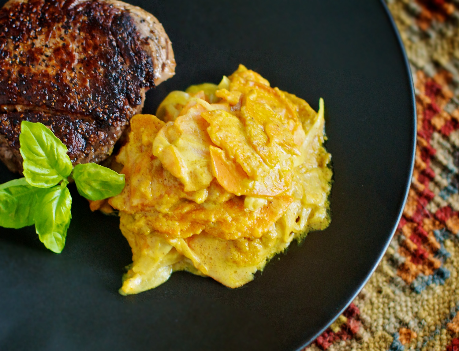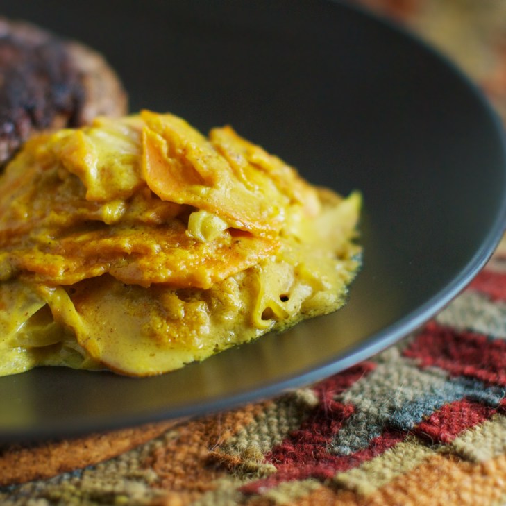 A gratin is a dish typically prepared using ingredients of thinly sliced and layered potatoes and cream cooked in a buttered dish. Well….yum! This preparation method originated in France (of course); the name gratin dauphinois refers to the Dauphiné region of France, where this method of preparing potatoes is a specialty (according to Wikipedia). Here’s another blog post where I’m going to bastardize the French method, yet call it a gratin anyway. Heresy, I know… This recipe is inspired by the flavors of African sweet potato soup, with hints of nut butter, lime and spicy cayenne pepper, and it has a touch of Asian/Indian flavors with the sweet curry and coconut milk.