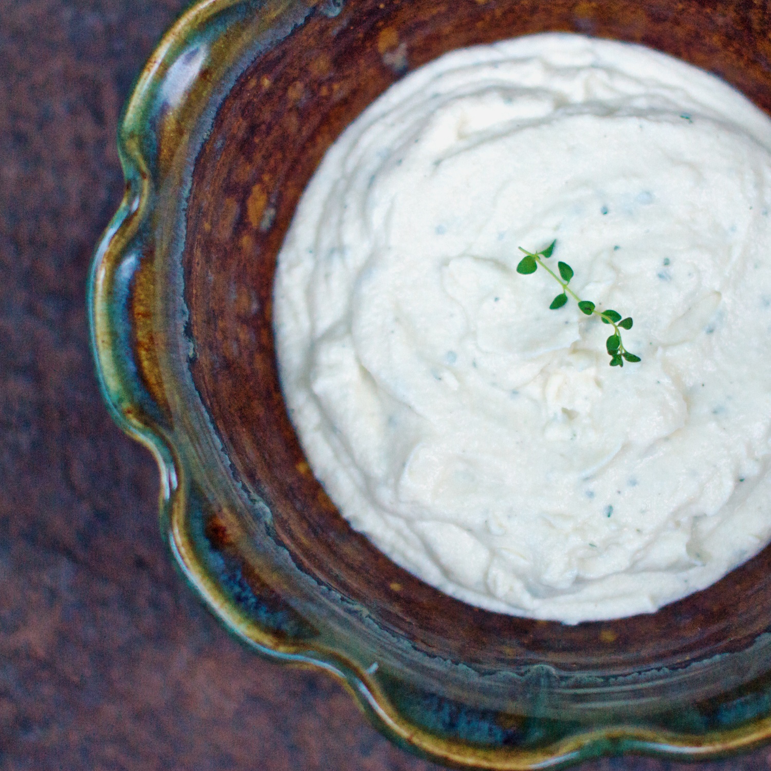 Place the drained cauliflower in a food processor with the goat cheese, thyme, and rosemary. Process until very smooth. Season with salt and pepper, to taste. If you’d like, drizzle with a little olive oil. Serve warm.