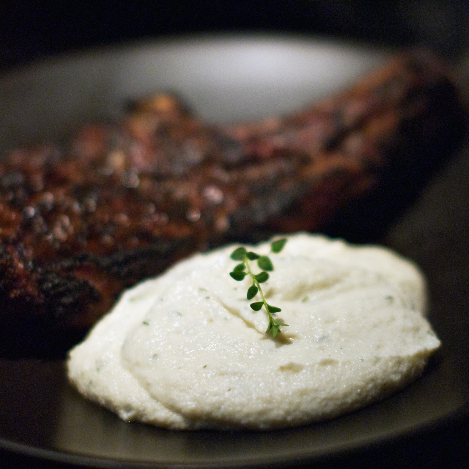 We ran across some MONSTER grass-fed ribeye steaks on-the-bone, perfect for Sunday Steak Night™! It seemed like a good night for a simple, mashed vegetable side dish. We have posted another recipe for mashed cauliflower, which I love, but it is really hearty and filling on its own. We needed something a little less rich to have with the ribeyes. This is a lighter version of mashed cauliflower – creamier in texture, but it still has a lot of flavor from the goat cheese and herbs.