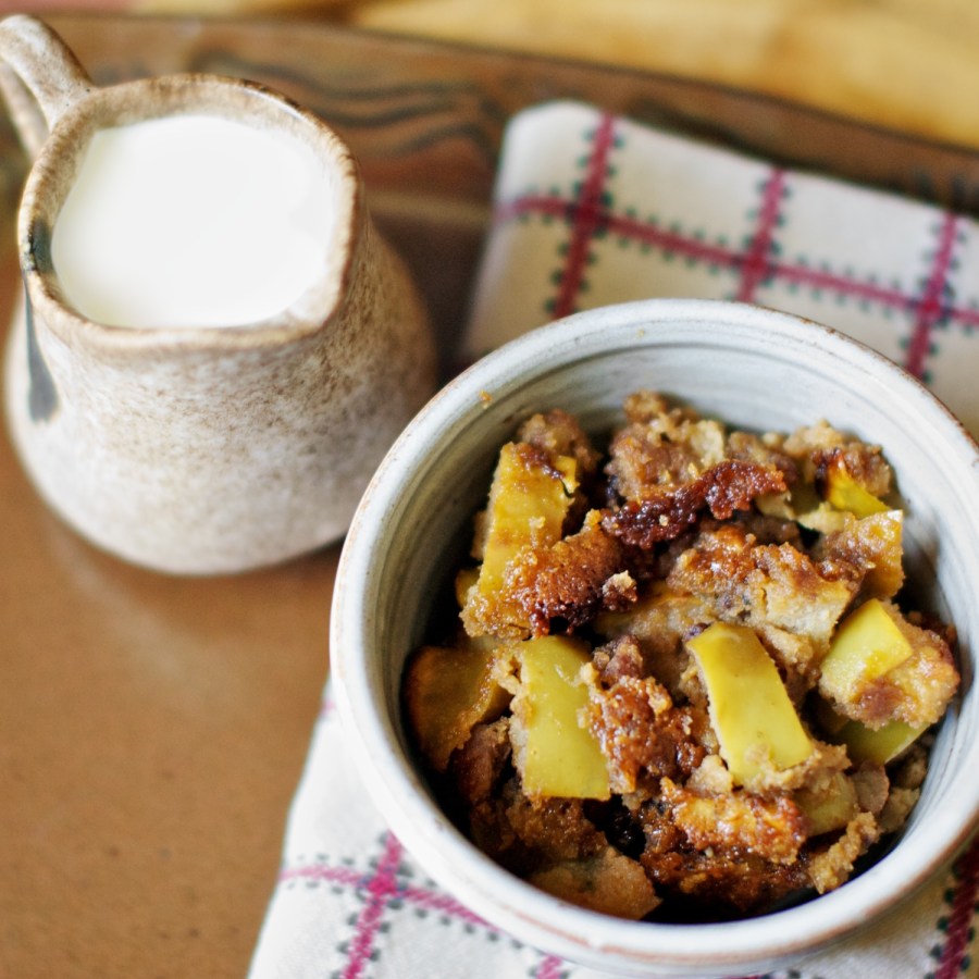 Pour into greased baking dish and bake 35-40 minutes or until apples are tender. Serve hot or cold, with cream or ice cream – or just by itself!