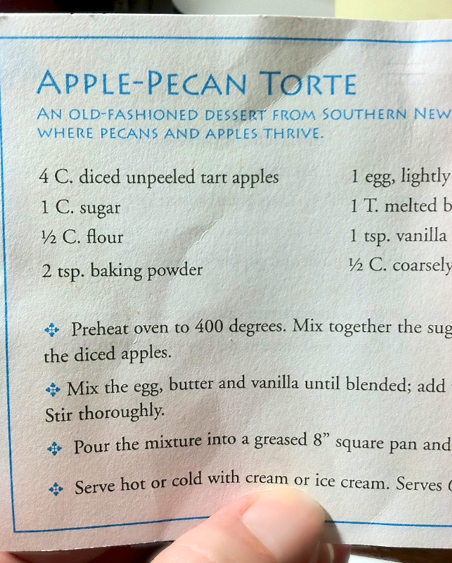 One day I received via the USPS a plain envelope with only a recipe card tucked inside – for Apple Pecan Torte. It came from our dear, sweet friend Malcolm….and he is indeed sweet, through and through. This man also possesses the biggest sweet tooth known to this planet, lending proof to the saying “you are what you eat”. I don’t think he’s even capable of having a meal without dessert! Last time we traveled with him, the catch-phase of the trip became “Do you have Pie?”, and you must pronounce “pie” as “Piiiiiiiiii” with a slow drawl, as Malcolm is Mississippi born and bred.