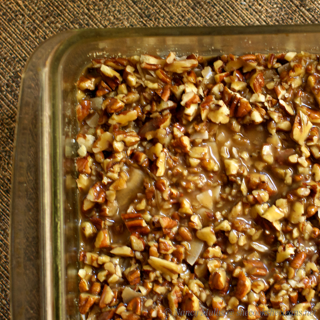 Sprinkle the chocolate chips, chopped nuts, and coconut flakes evenly over the crust. Pour the sweetened coconut milk over everything. Bake at 350F for 25-30 minutes, until lightly browned.