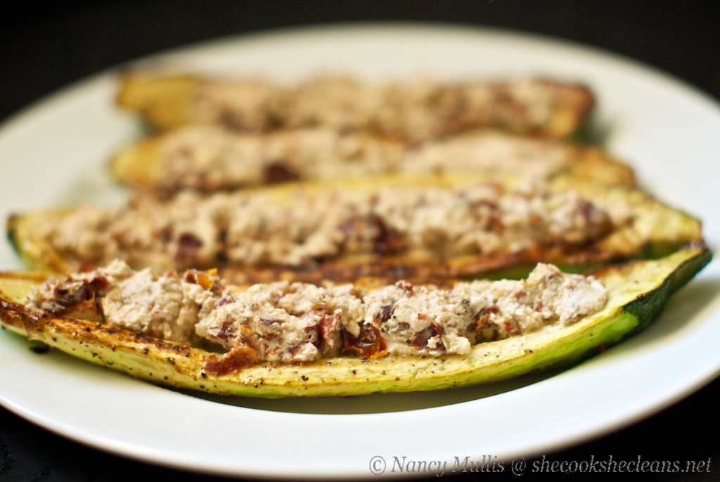 In the meantime, mix the goat cheese with the garlic, sun-dried tomatoes, nuts, and bacon. When the zucchini are cool enough to handle, divide the goat cheese among the zucchini halves, spreading down the center.