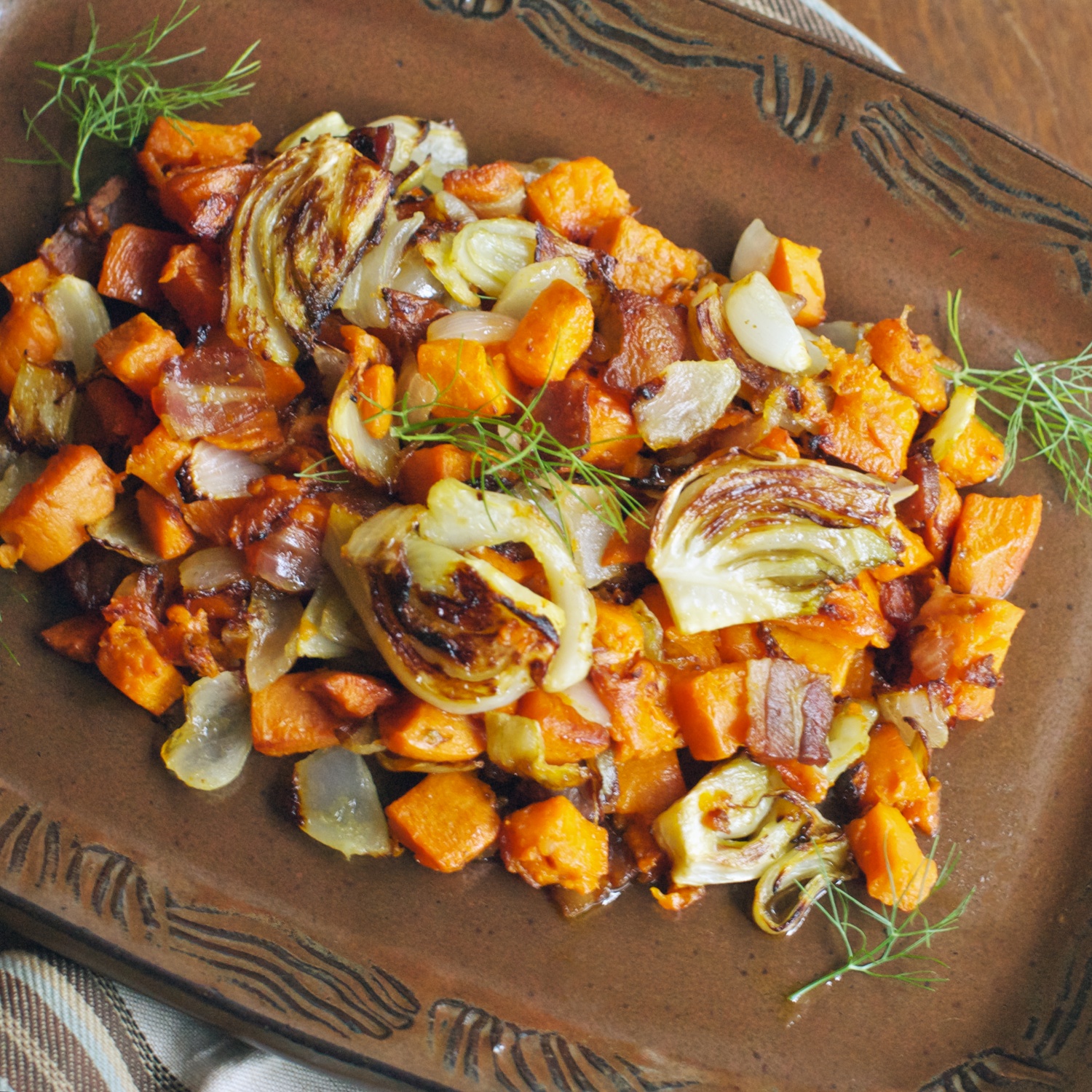 Place the fennel, sweet potato, and onion into a shallow roasting pan. Season with kosher salt and freshly ground black pepper. Gently toss with just enough olive oil to coat the vegetables and the pan. Arrange the bacon pieces over the vegetables. Roast at 400F, stirring occasionally, until vegetables are browned in places and bacon is cooked (approximately 40 minutes).