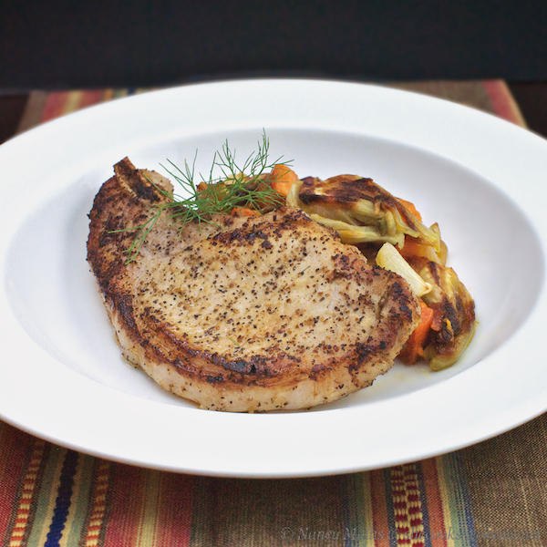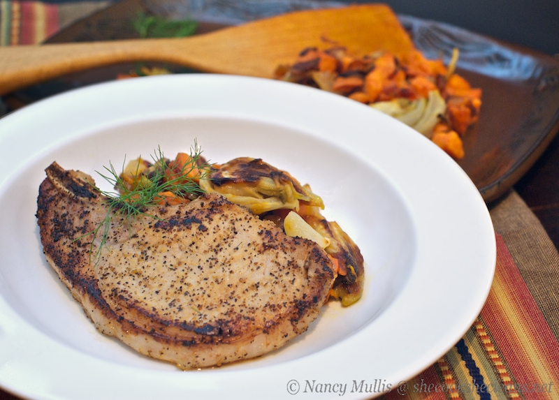Pork chops are so easy. They cook up quickly without much fuss, which makes them great for mid-week dinners. I especially like pork paired with something that has a little sweetness. Fruits like apples, cherries, and apricots are clear winners – but so are the sugars from slowly caramelized fennel, onion, and sweet potatoes in this hash.