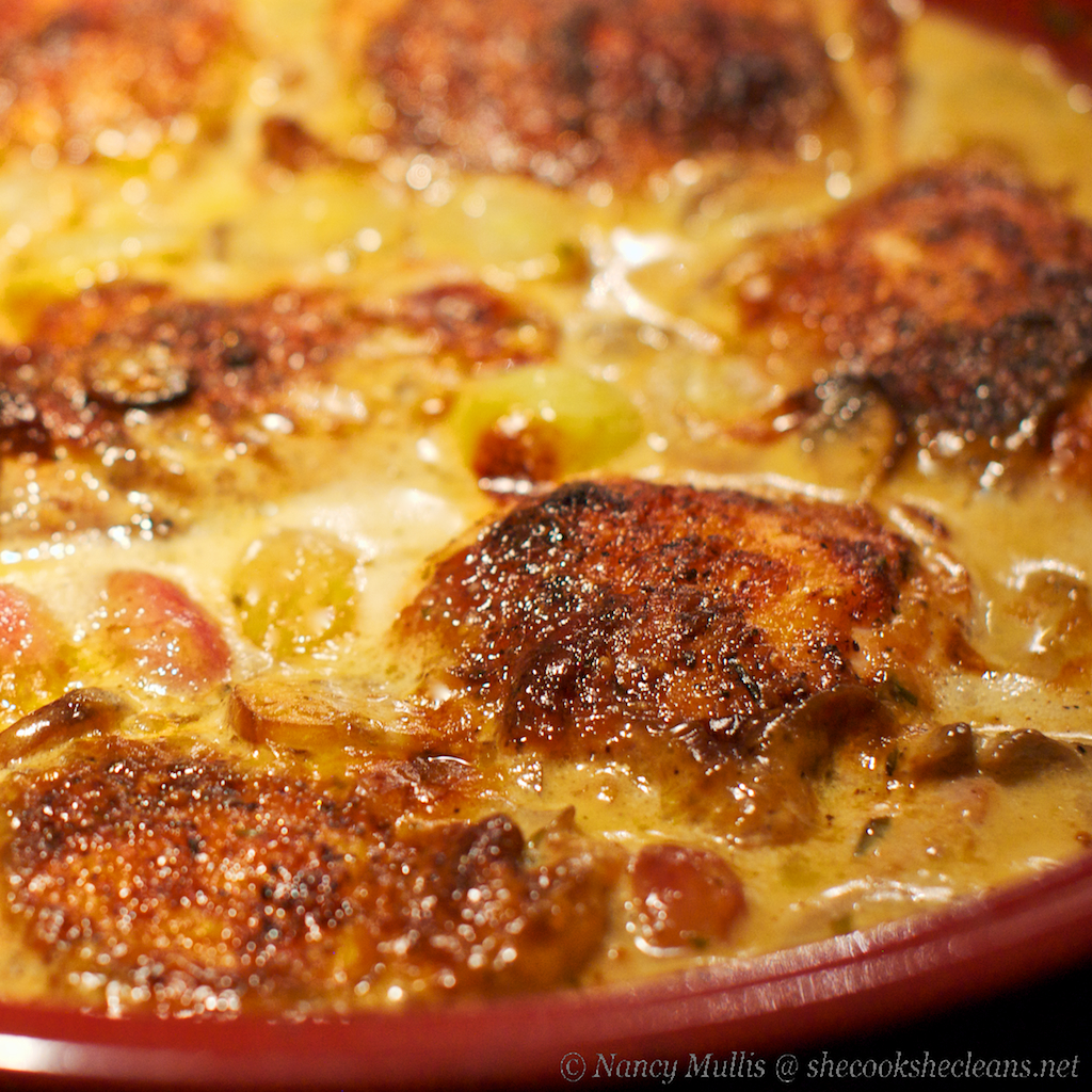This recipe fit nicely in the tagine, but would work equally well in any baking dish. We enjoyed the saucy chicken with roasted vegetables; it could be served over noodles or rice as well. The grapes are only heated until warmed throughout, so they add a fresh burst of clean flavor that contrasts well with the rich mushroom cream sauce.