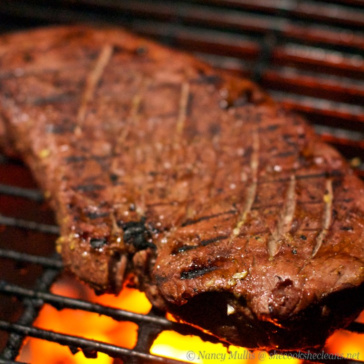 Last year we bought a 1/4 grass-fed cattle share – most of which has been consumed. There were a few odd cuts of steak remaining, like this large package labeled “London Broil”. Now best I can tell, “London Broil” is not the name of a cut of meat, it is more of a preparation method. My guess is this piece of meat is a top round steak because it is very lean and it is pretty large (around 2 pounds). Top round steak has a nice beefy taste, but it can also be chewy and tough unless prepared correctly. You could also use flank steak, sirloin, or skirt steak for this recipe.