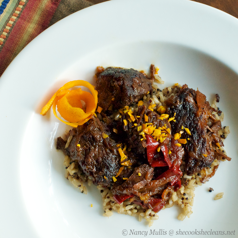 Cover and put the roast in the oven to braise for approximately 2 1/2 hours, until the roast is fork-tender. Check on the roast occasionally to make sure there is adequate liquid in the pan (don’t let it get dry). Toward the end of the cooking time, partially uncover the roast to encourage the top to brown, and to reduce some of the liquid if necessary. Remove the orange pieces before serving.
