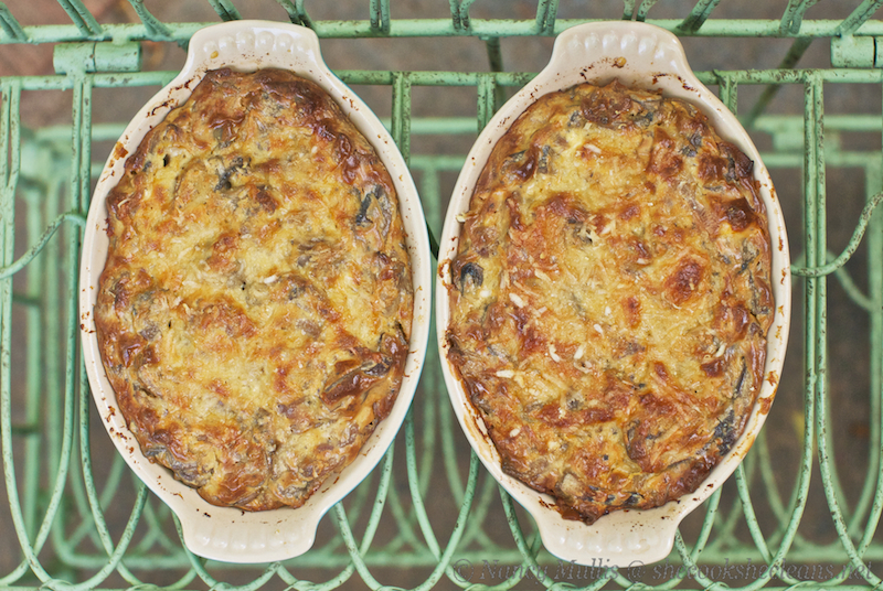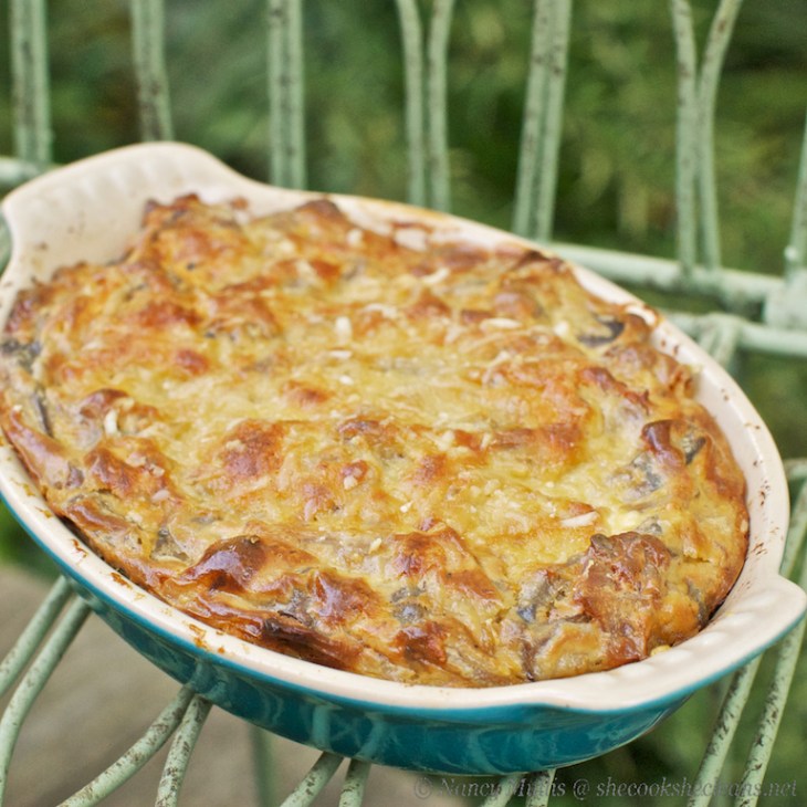 This gratin has a nice medley of tastes, from the earthy mushrooms, smoky bacon, and the sweet tanginess of goat cheese and sour cream. If you like mushrooms stuffed with bacon and cheese, just think, this is like having a bowl of those appetizers all to yourself. Yum!