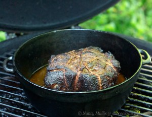 After about 6 hours, the temperature of the butt seemed to be stuck in the 160F range. This, I found from reading blogs about meat smoking, is known as the “Stall”. We want the meat to get above 170F, because that’s where the magic happens. Around 170F is when the collagen in the meat begin to melt and turn gelatinous, and the meat becomes more tender and juicy and scrumptious. One way to get around the “Stall” is to cover that butt to keep the juices from evaporating, and thereby cooling the meat. I plopped it in a cast iron pot with a little apple juice, sealed it up with foil, and put it back on the grill. If you don’t have a pot handy that you want to stick in a grill, you can also wrap it securely with foil.