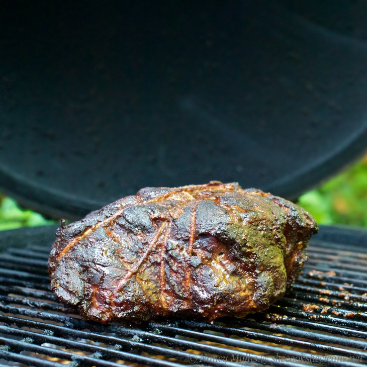 About an hour before cooking, I took the boneless pork butt (around 3.5 pounds) out of the refrigerator. It got a nice rub down with olive oil, then I liberally applied the Dizzy Dust all over the butt. (No snickering…) The butt was then tied up with kitchen twine. We let it sit there on the counter to come to room temperature while the spice rub melded on the surface of the meat.