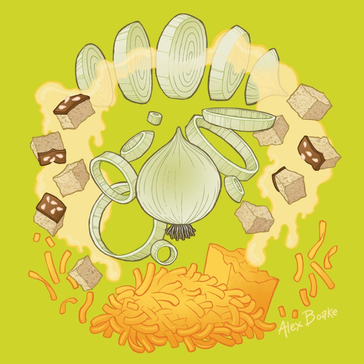 Recently Alex contacted us with a proposition for a “recipe swap”, in which she would prepare one of our recipes and illustrate it, and we would prepare one of hers and photograph it. I was very excited and thrilled with her suggestion – since I had been following her blog, I knew she had swapped recipes before with The Domestic Man and Jan’s Sushi Bar (two excellent blogs, by the way). Those swaps turned out beautifully! I picked Alex’s Onions au Gratin – I am a sucker for anything with cheese and I loved that she adapted her grandmother’s recipe, a family favorite, to be gluten-free. I can see why it is a favorite – it is fantastic!