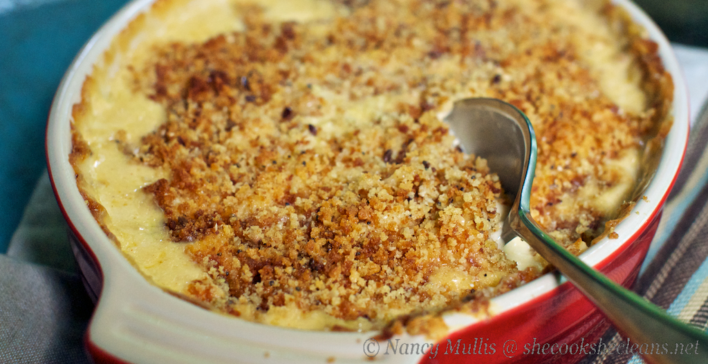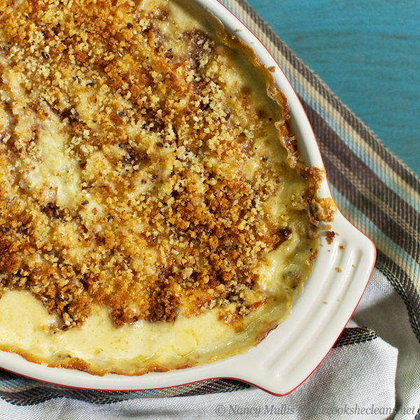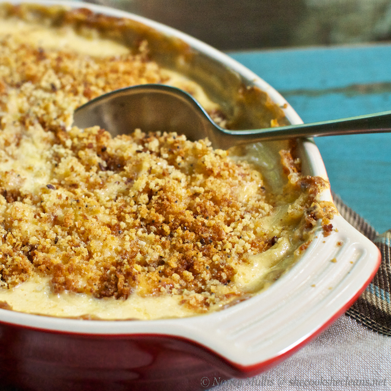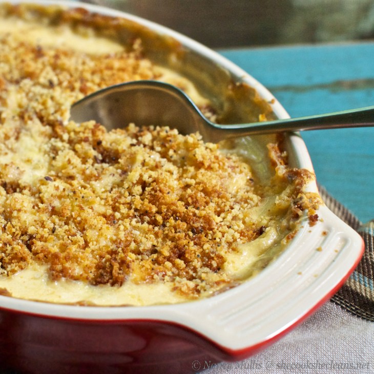 This dish is perfect with roasted or grilled meats; its creamy cheese sauce and crisp, buttery crumb topping provides a decadent contrast to the simply prepared meat. It would also work as a vegetarian entree, provided of course that dairy is not a problem. Hoping that Alex will forgive me, I’ve taken a few liberties with her original recipe (found here) – mostly due to what ingredients I had on hand, but also because I have a compulsion to tinker with things. However, I think the result is still true to her creation. Thank you, Alex, for including us in the recipe swapping!