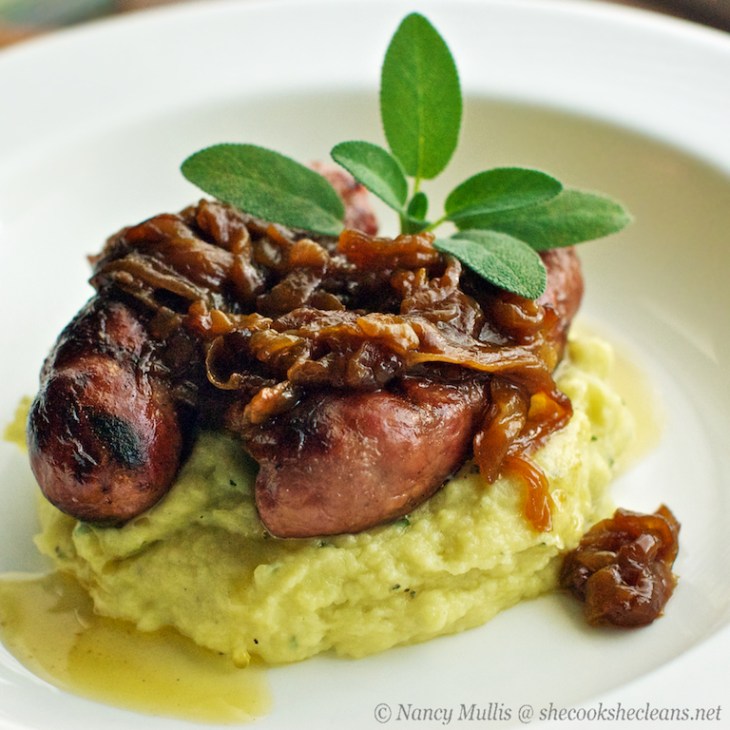 Since these potatoes are so sweet already, I used fresh sage to add a more savory aspect to the mash, along with copious amounts of cream and butter (of course). We really liked the combination of the grilled sausages with the sage and the sweet potatoes – and the caramelized onions were like the cherry on top of a banana split. Yum!