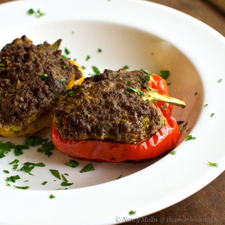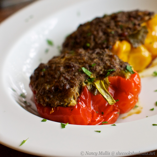 As you can see from the photo, the meat filling in the peppers is pretty dense – it turned out almost like a small meatloaf. That is because I added too much egg to the filling. As a result, I reduced the amount of egg in the recipe that I have posted below – although there was nothing wrong with meatloaf-stuffed peppers! Another idea that might improve the presentation would be to mix some cooked rice in with the meat, to lighten the texture and add more color.