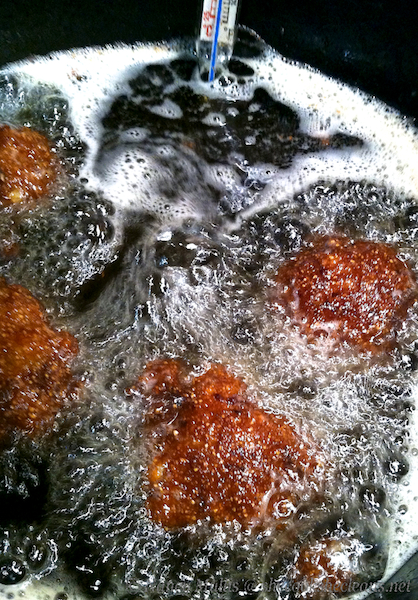 As you cook, try to maintain the temperature between 350F and 375F, and add oil if necessary between batches. You also will want to use a mesh strainer to scoop out any stray bits or foam so they will not burn and mess up your oil.