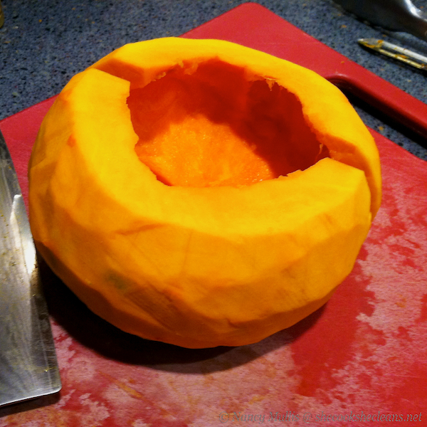 I did my research, of course, to see how to best approach the squash. This squash has a thin skin, compared to other winter squash, and doesn’t always require peeling. However this one had some barnacle-like attachments, so I thought it best to get rid of them. Like most winter squash, it take some effort and muscle to make that first cut into the squash – this is made easier if you first trim off the stem end.