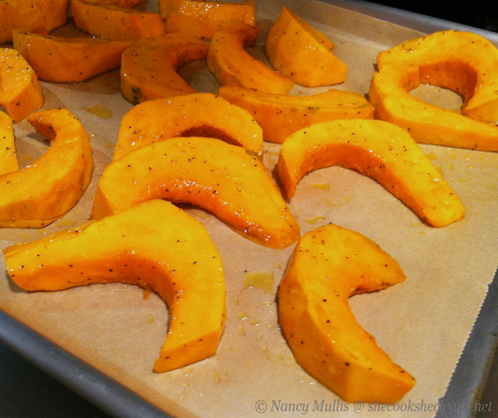 Next, just slice it up and toss those slices with a little oil, salt and pepper. If you want to get fancy, you could add some other spices as you see fit, but the basic salt and pepper is simple and delicious. Roast the squash slices at 400F for 20-30 minutes, until they are soft and tender. This squash is very sweet – sort of a cross between sweet potato and butternut squash – and I like it when the edges are a little browned and caramelized with the natural sugars.