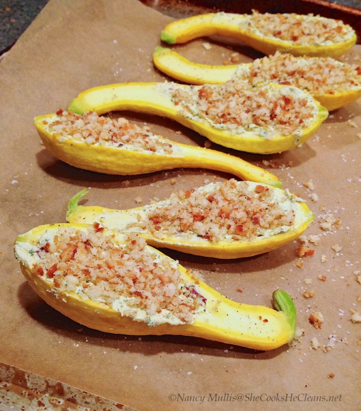 - Divide the goat cheese mixture among the squash boats. Gently press bread crumbs onto the cheese.